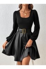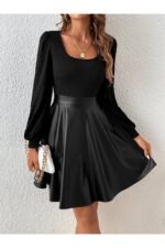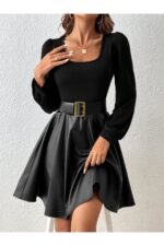 Deri ve Ribana Üst ile Şık Uzun Kollu Bluz (Kemersiz)