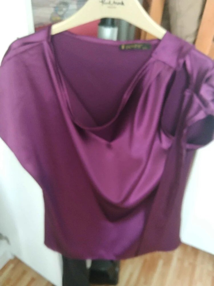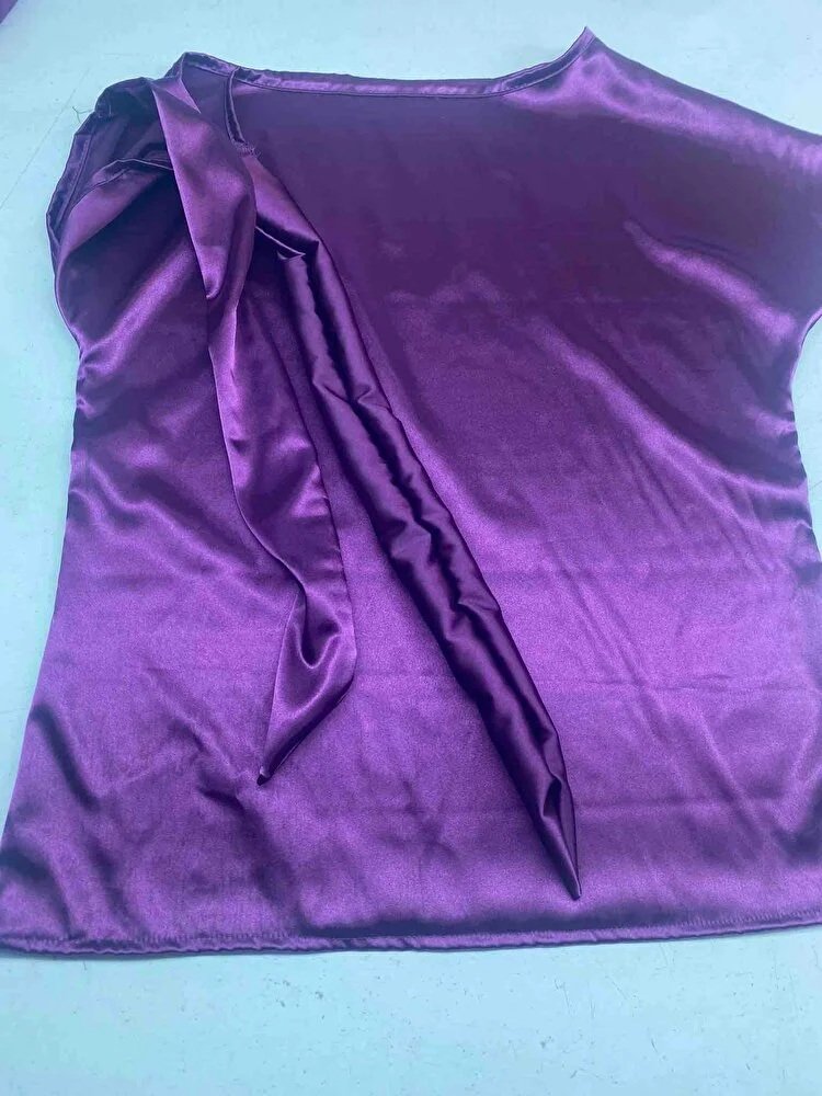 Gardırobunuza şıklık katacak bir parça mı arıyorsunuz? Omuzu düğümlü saten kumaş kısa kollu mor bluz, zarif ve modern tasarımıyla tam size göre!